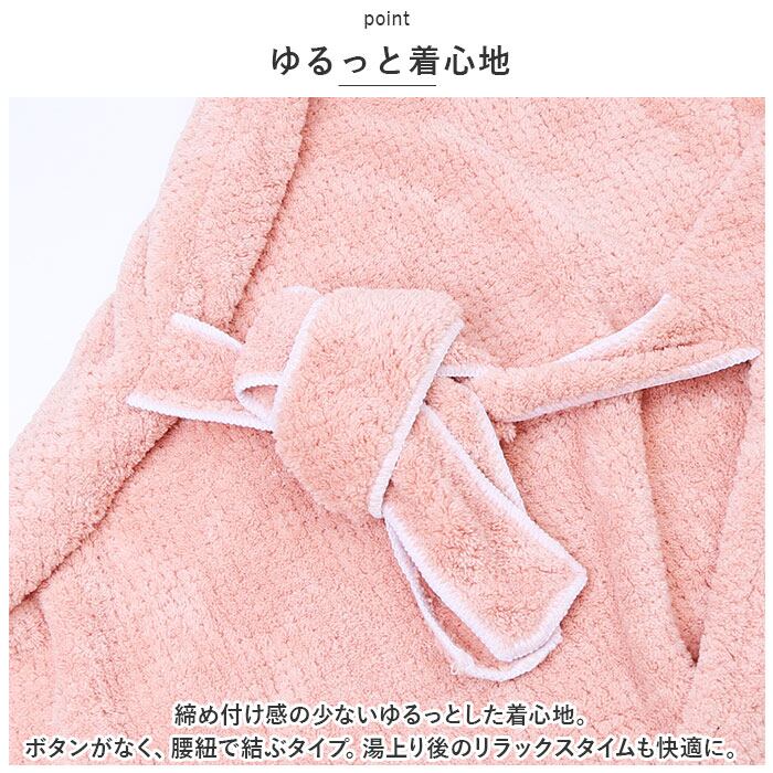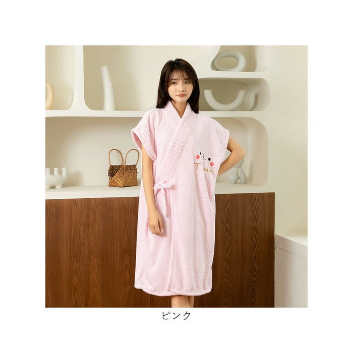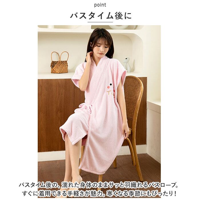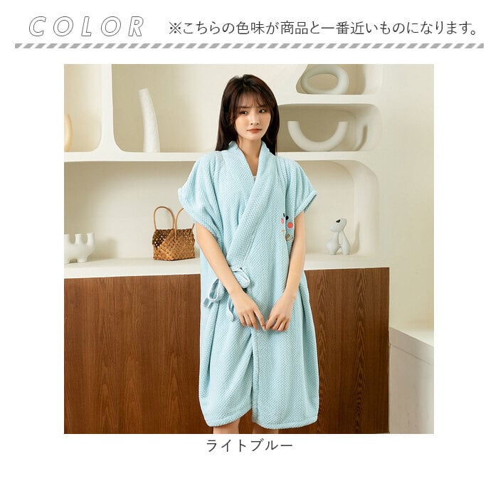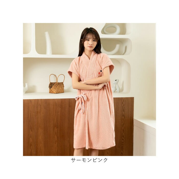 ・バスタイム後の、濡れた身体のままサッと羽織れるバスローブ。すぐに着用できる手軽さが魅力。寒くなる季節にもぴったり!