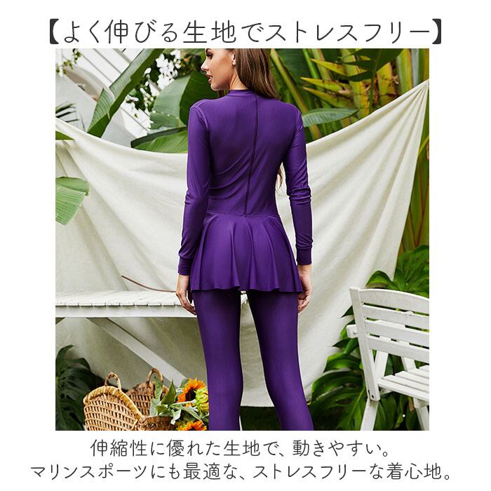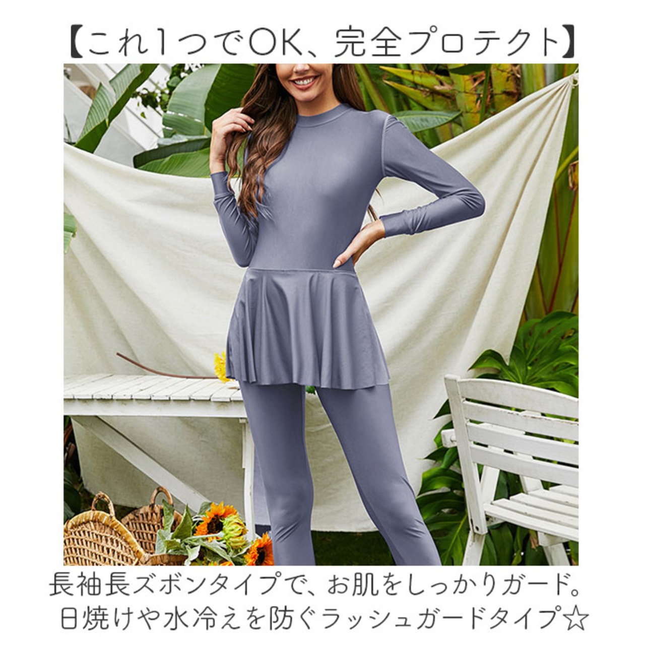 ・長袖長ズボンタイプで、お肌をしっかりガード。日焼けや水冷えを防ぐラッシュガードタイプ☆