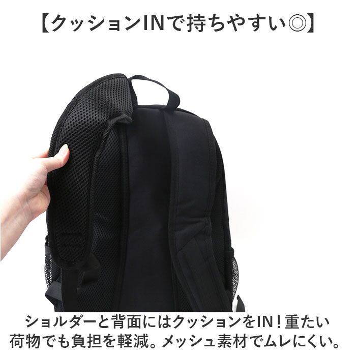・ショルダーと背面にはクッションをIN!重たい荷物でも負担を軽減。メッシュ素材でムレにくい。