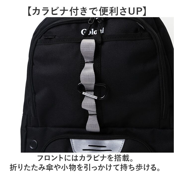 ・フロントにはカラビナを搭載。折りたたみ傘や小物を引っかけて持ち歩ける。