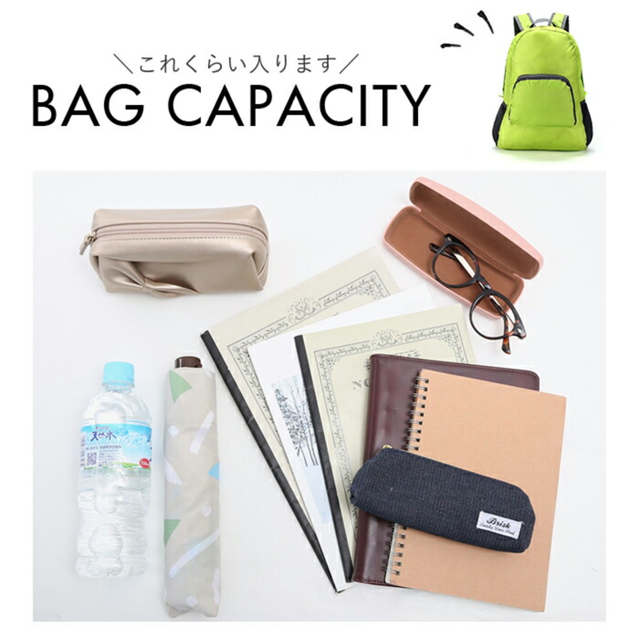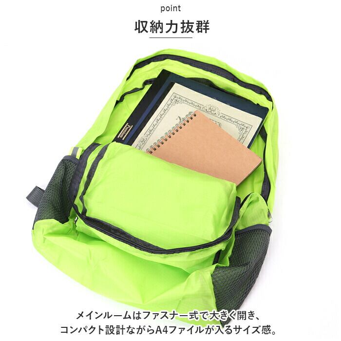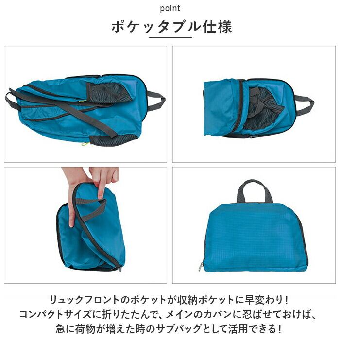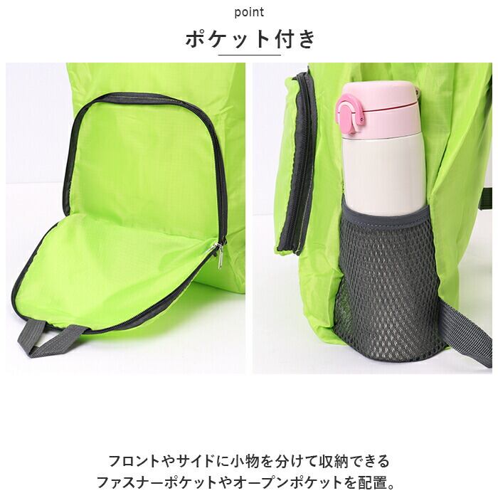 ・リュックフロントのポケットが収納ポケットに早変わり!コンパクトサイズに折りたたんで、メインのカバンに忍ばせておけば、急に荷物が増えた時のサブバッグとして活用できる!
