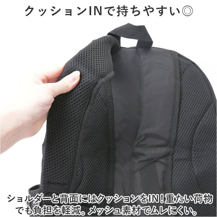 ・ショルダーと背面にはクッションをIN!重たい荷物でも負担を軽減。メッシュ素材でムレにくい。