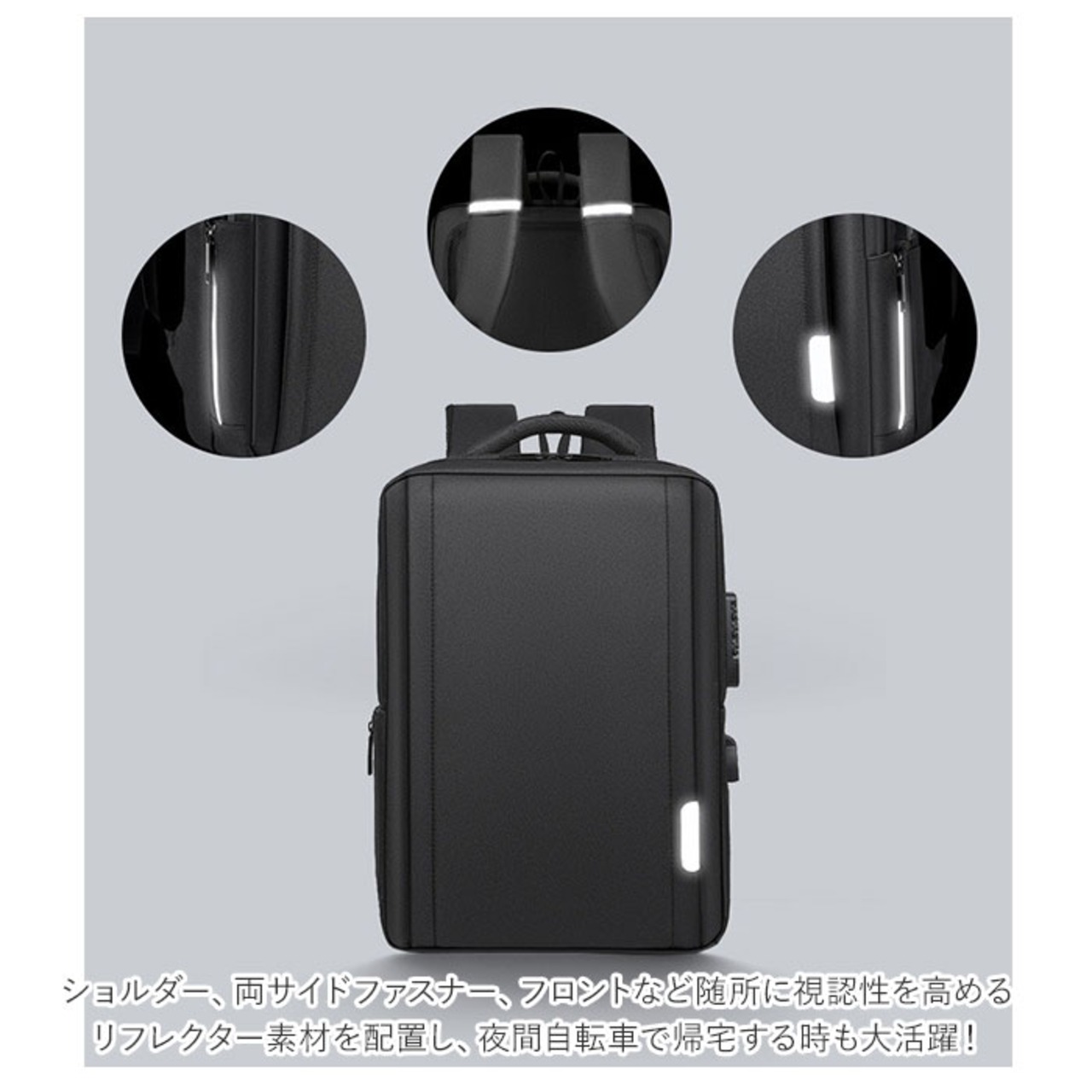 ・ショルダー、両サイドファスナー、フロントなど随所に視認性を高めるリフレクター素材を配置し、夜間自転車で帰宅する時も大活躍!