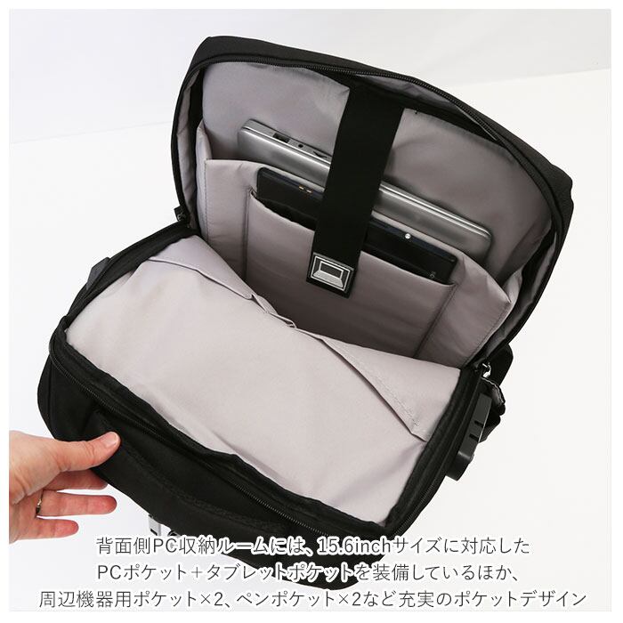 ・背面側PC収納ルームには、15.6inchサイズに対応したPCポケット+タブレットポケットを装備しているほか、周辺機器用ポケット×2、ペンポケット×2など充実のポケットデザイン。