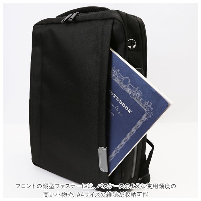 ・フロントの縦型ファスナーには、パスケースのような使用頻度の高い小物や、A4サイズの雑誌が収納可能。