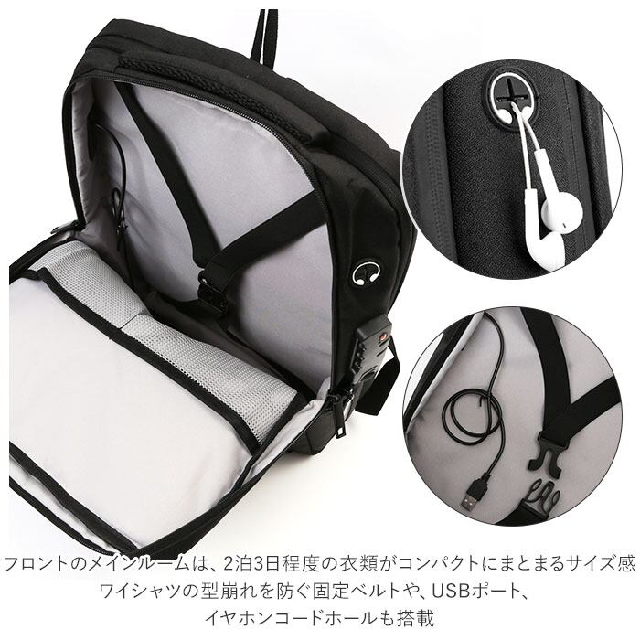 ・ワイシャツの型崩れを防ぐ固定ベルトや、USBポート、イヤホンコードホールも搭載。
