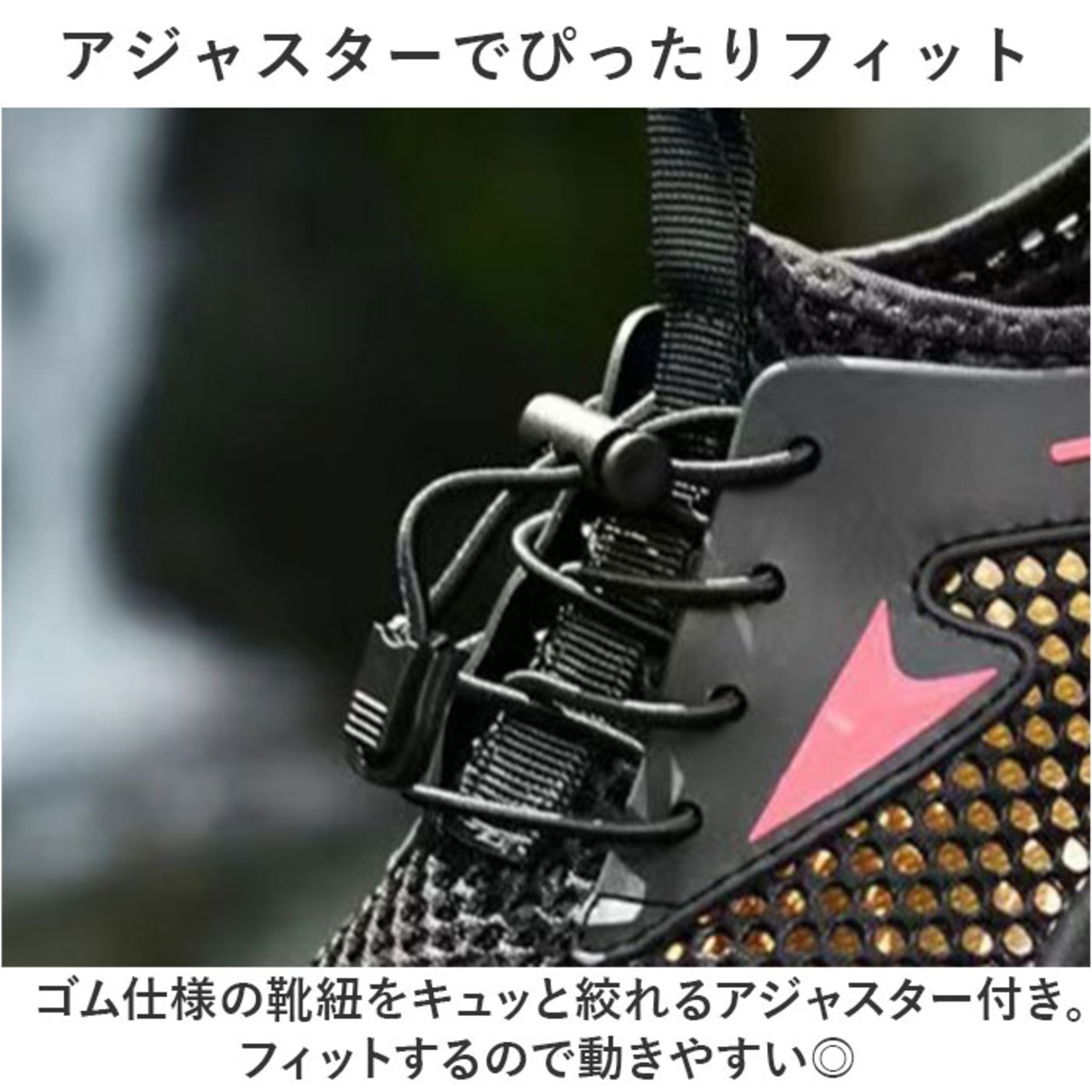 ・ゴム仕様の靴紐をキュッと絞れるアジャスター付き。フィットするので動きやすい◎