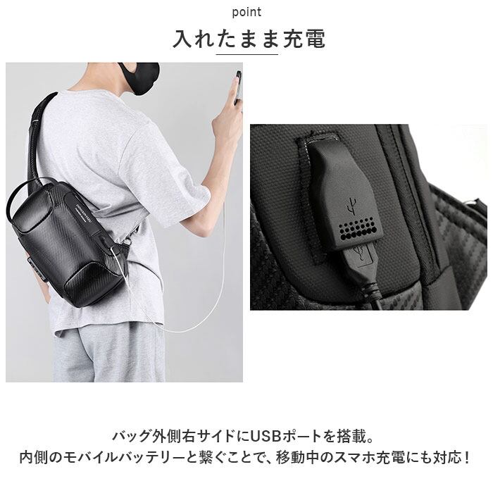 ・バッグ外側右サイドにUSBポートを搭載。内側のモバイルバッテリーと繋ぐことで、移動中のスマホ充電にも対応!