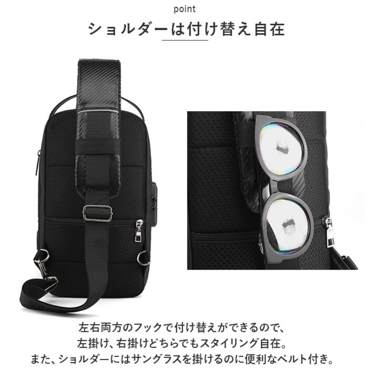 ・左右両方のフックで付け替えができるので、左掛け、右掛けどちらでもスタイリング自在。また、ショルダーにはサングラスを掛けるのに便利なベルト付き。