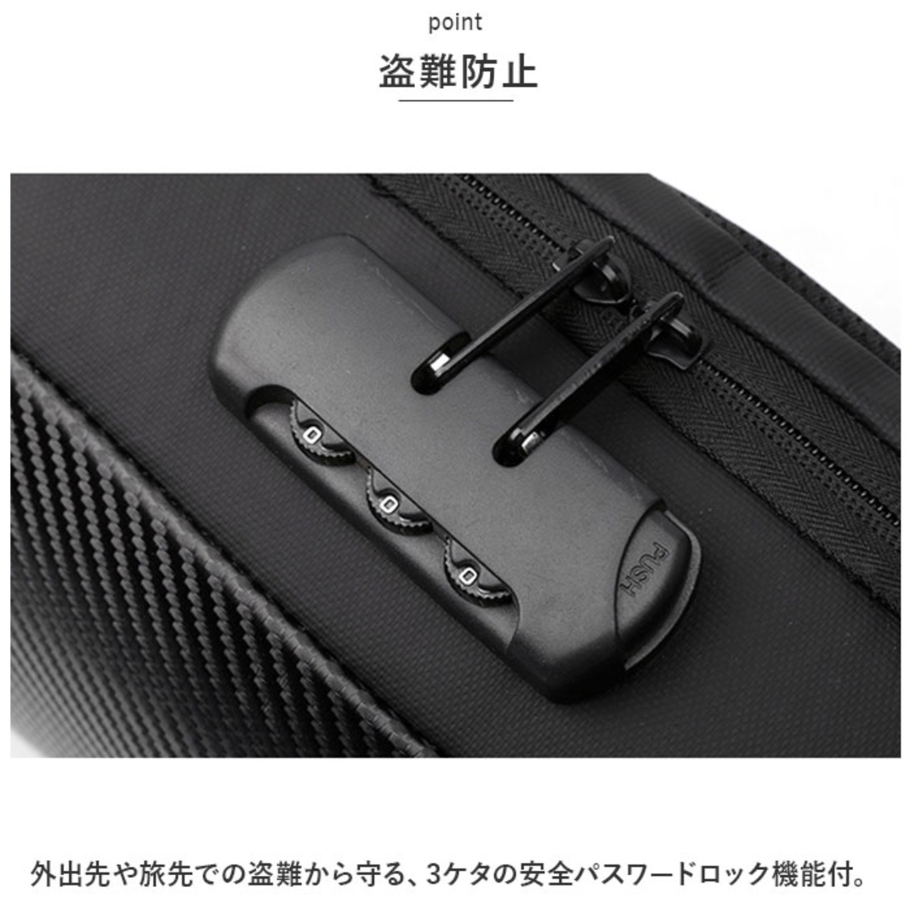 ・外出先や旅先での盗難から守る、3ケタの安全パスワードロック機能付。