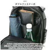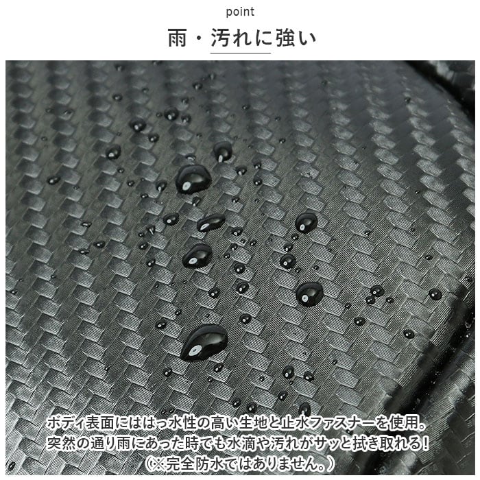 ・ボディ表面にははっ水性の高い生地と止水ファスナーを使用。突然の通り雨にあった時でも水滴や汚れがサッと拭き取れる!(※完全防水ではありません。)