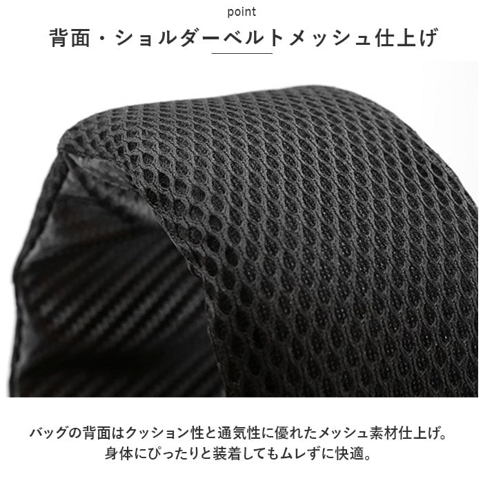 ・バッグの背面はクッション性と通気性に優れたメッシュ素材仕上げ。身体にぴったりと装着してもムレずに快適。