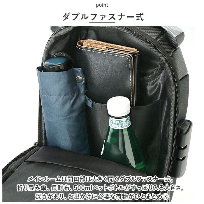 ・メインルームは開口部は大きく開くダブルファスナー式。折り畳み傘、長財布、500mlペットボトルがすっぽり入る大きさ。深さがあり、お出かけに必要な荷物がひとまとめ◎