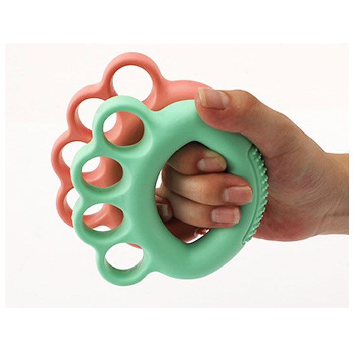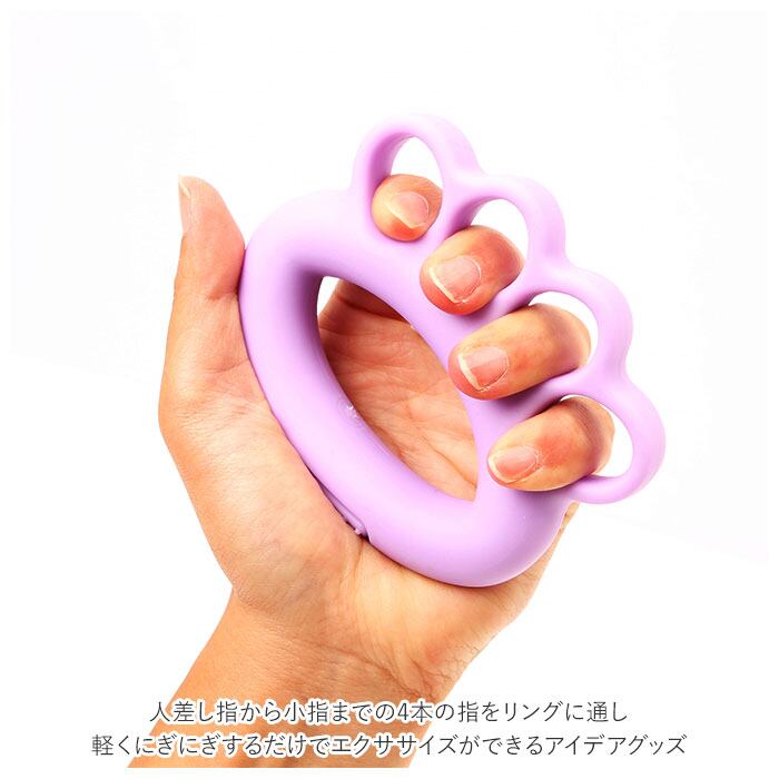 ・人差し指から小指までの4本の指をリングに通し、軽くにぎにぎするだけでエクササイズができるアイデアグッズ。