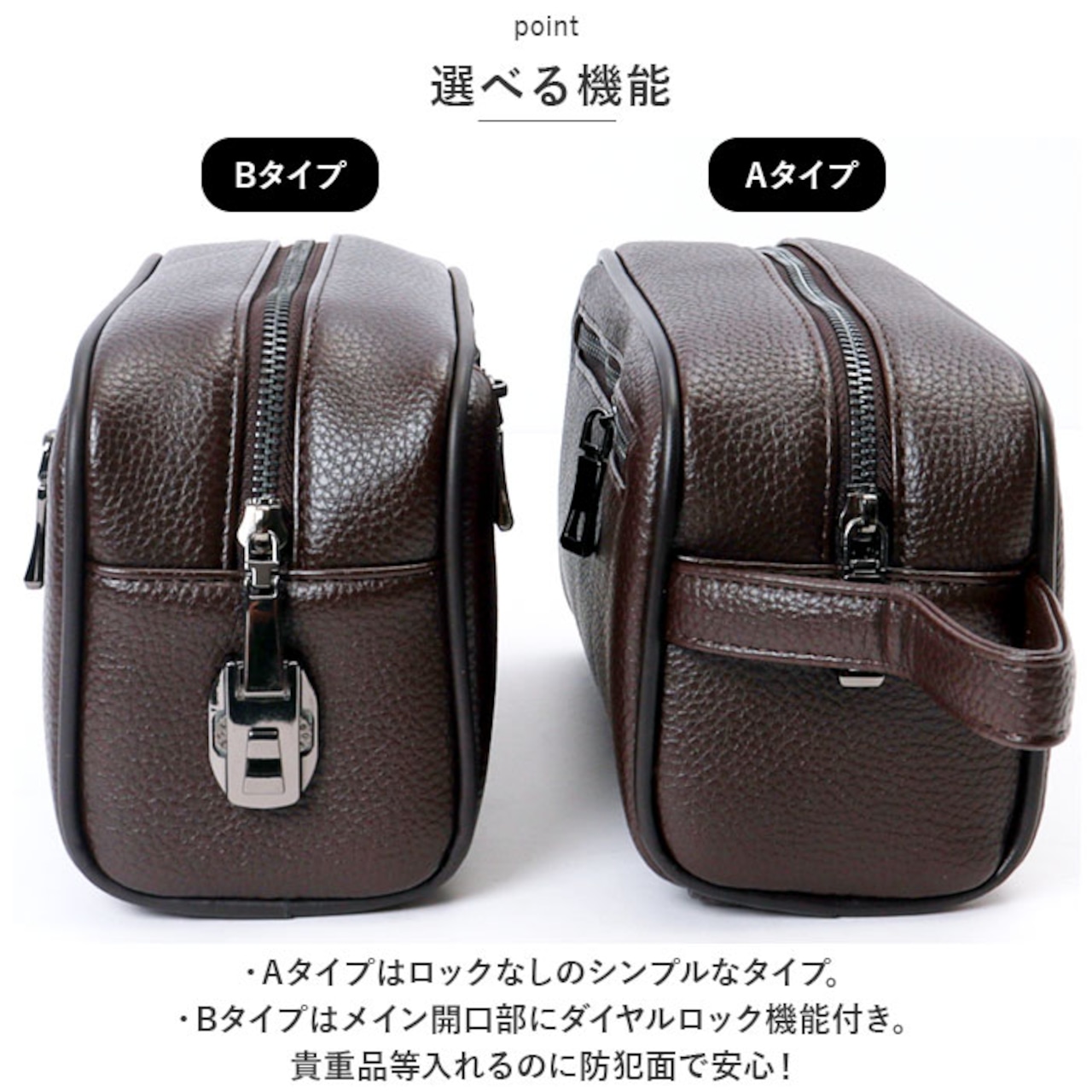 ・Bタイプはメイン開口部にダイヤルロック機能付き。貴重品等入れるのに防犯面で安心!
