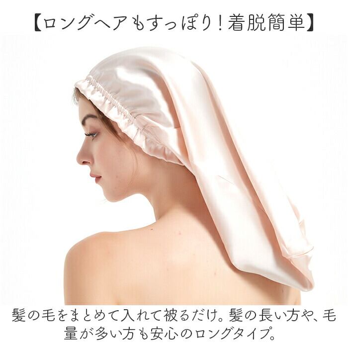 ・髪の毛をまとめて入れて被るだけ。髪の長い方や、毛量が多い方も安心のロングタイプ。