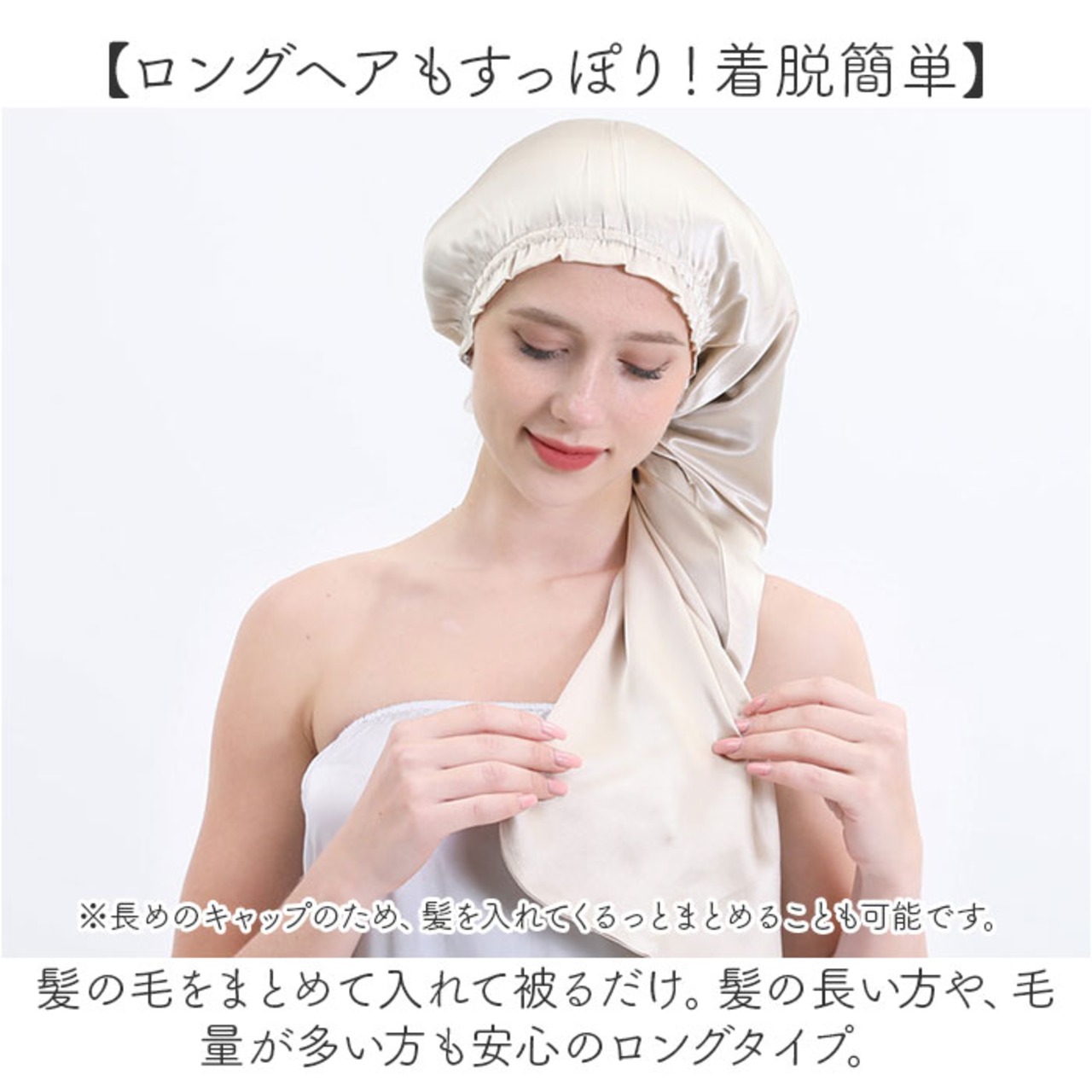 ・髪の毛をまとめて入れて被るだけ。髪の長い方や、毛量が多い方も安心のロングタイプ。