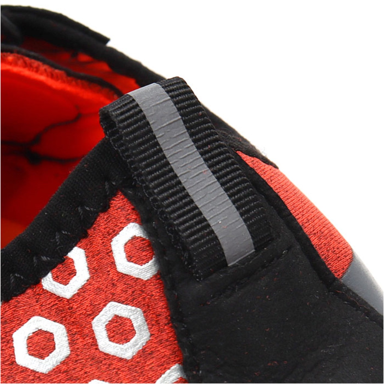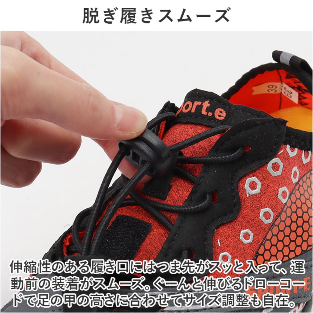 ・伸縮性のある履き口にはつま先がスッと入って、運動前の装着がスムーズ。ぐーんと伸びるドローコードで足の甲の高さに合わせてサイズ調整も自在。