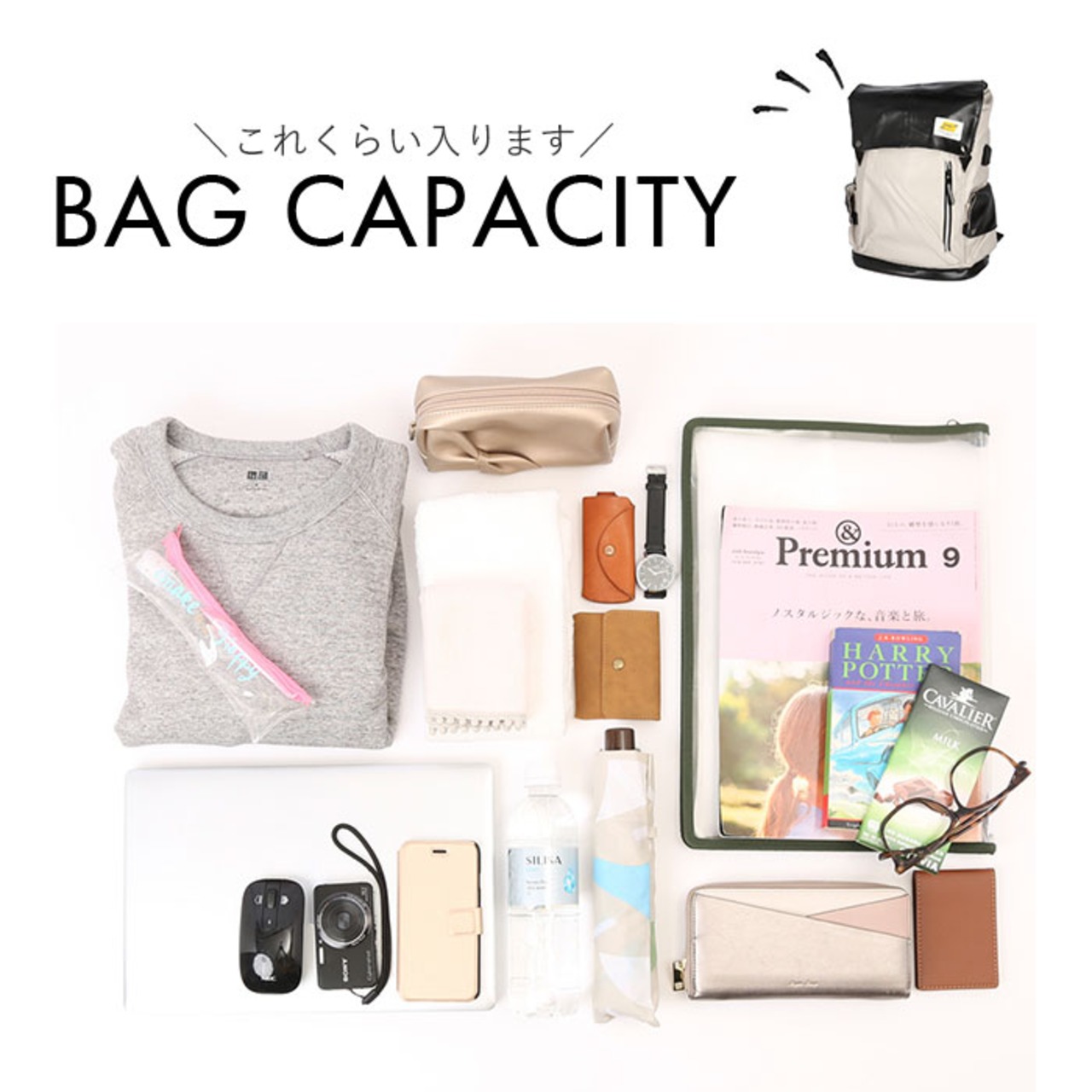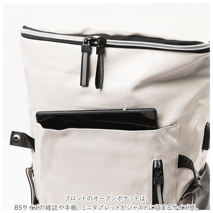 ・フロントのオープンポケットは、B5サイズの雑誌や手帳、ミニタブレットがジャストに収まるサイズ感。縦型のファスナーポケットからは、スマホがサッと取り出せて便利。