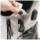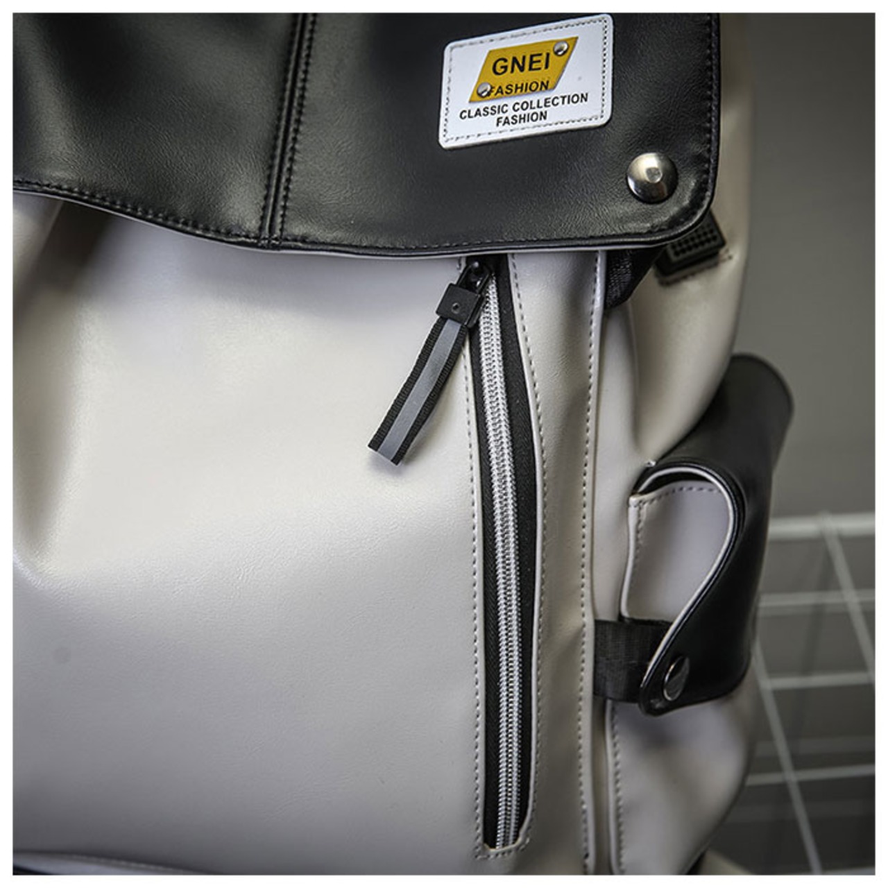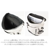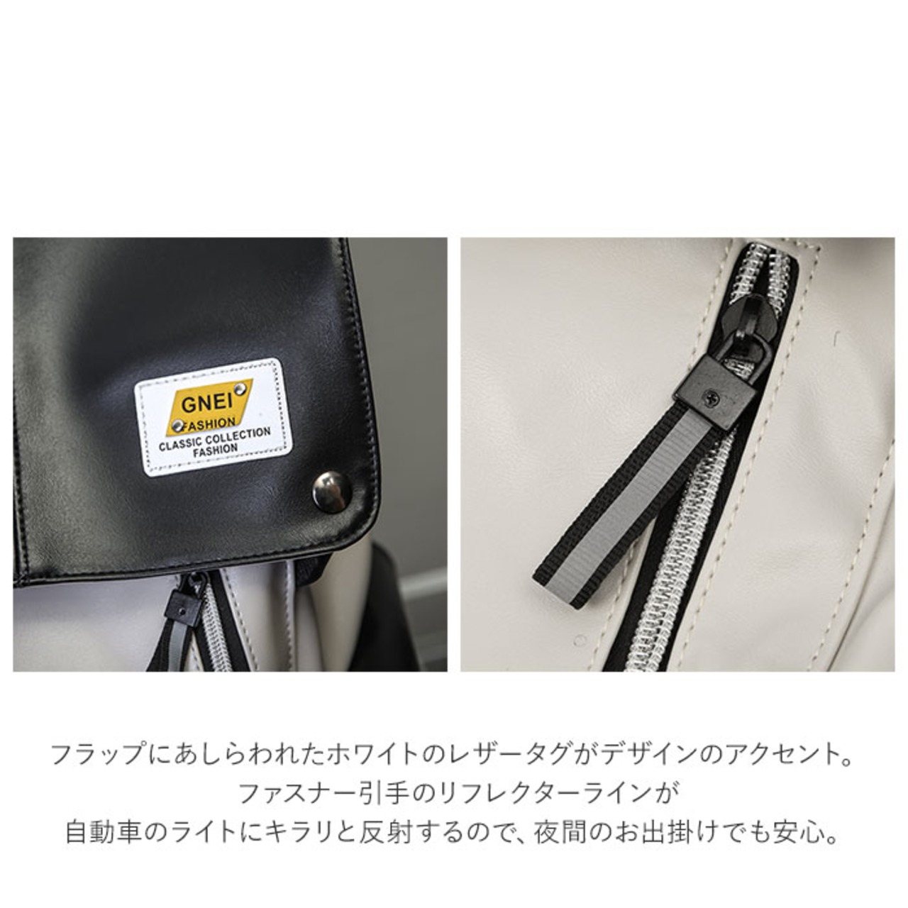 ・フラップにあしらわれたホワイトのレザータグがデザインのアクセント。ファスナー引手のリフレクターラインが自動車のライトをキラリと反射するので、夜間のお出掛けでも安心。