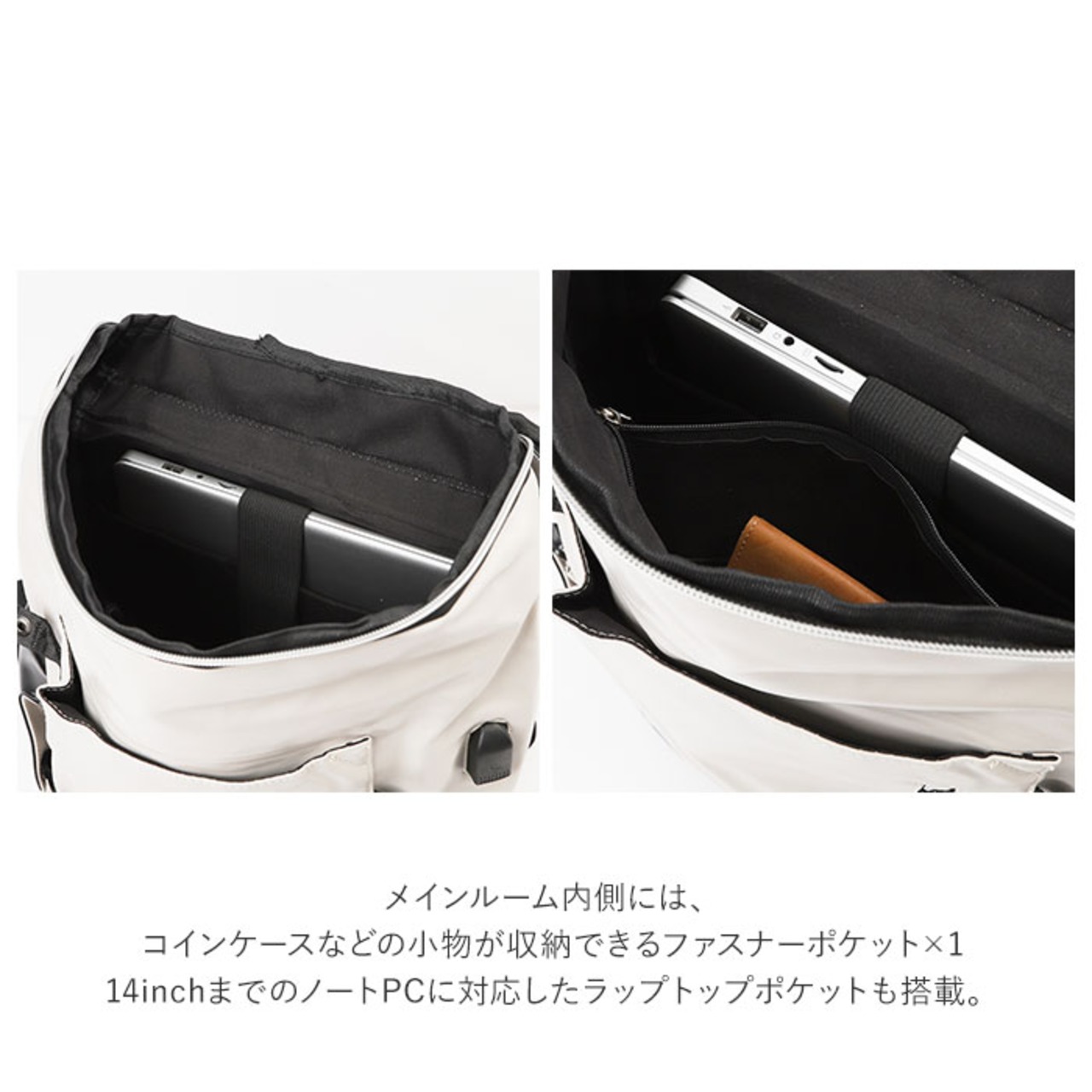 ・メインルーム内側には、コインケースなどの小物が収納できるファスナーポケット×1に、14inchまでのノートPCに対応したラップトップポケットも搭載。