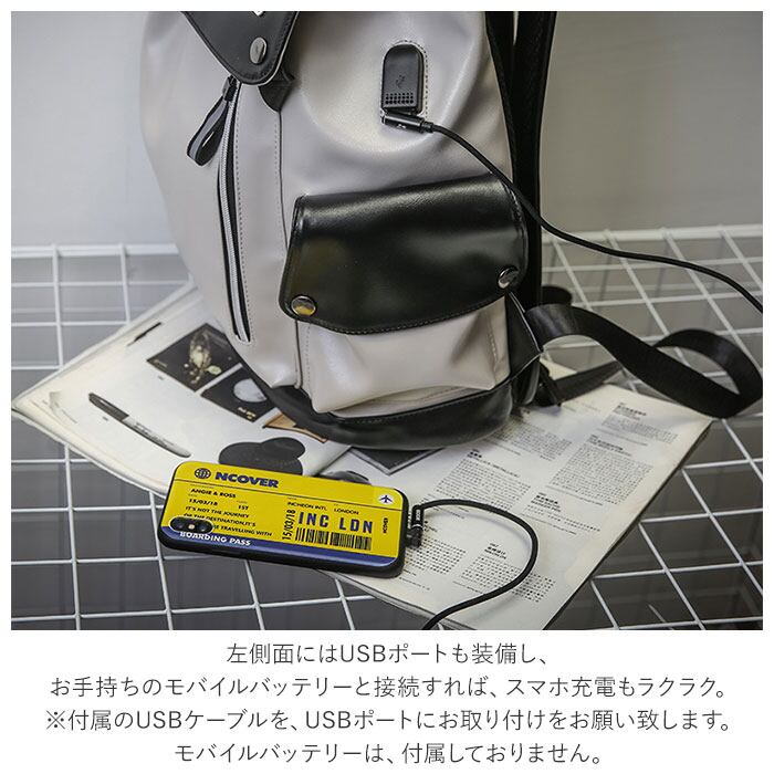 ・左側面にはUSBポートも装備し、お手持ちのモバイルバッテリーと接続すれば、外出先でのスマホ充電もラクラク。(※付属のUSBケーブルを、お客様ご自身でUSBポートに取り付けていただくスタイルです。モバイルバッテリー付属しておりません。)