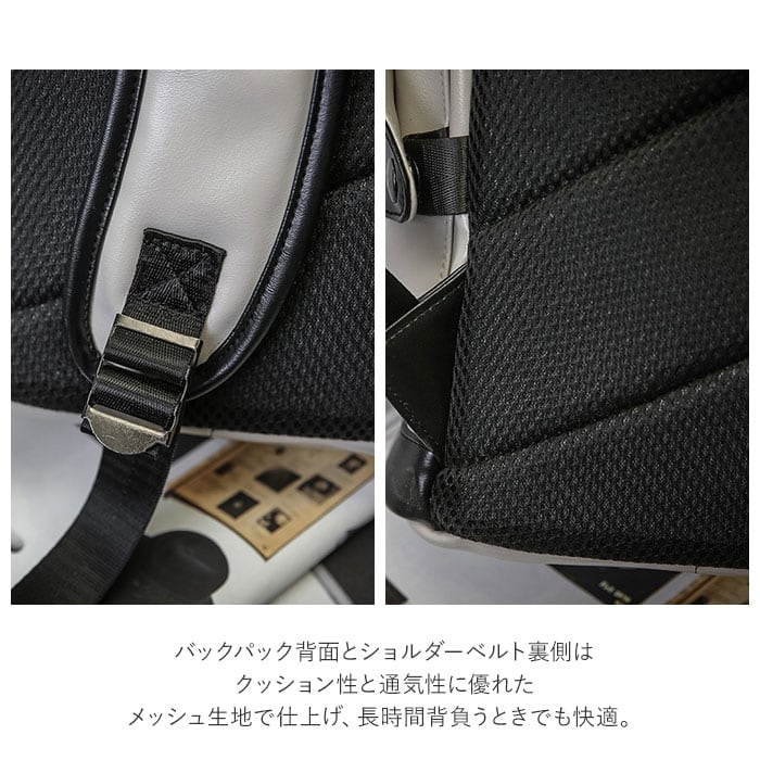 ・バックパック背面とショルダーベルト裏側はクッション性と通気性に優れたメッシュ生地で仕上げ、長時間背負うときでも快適。