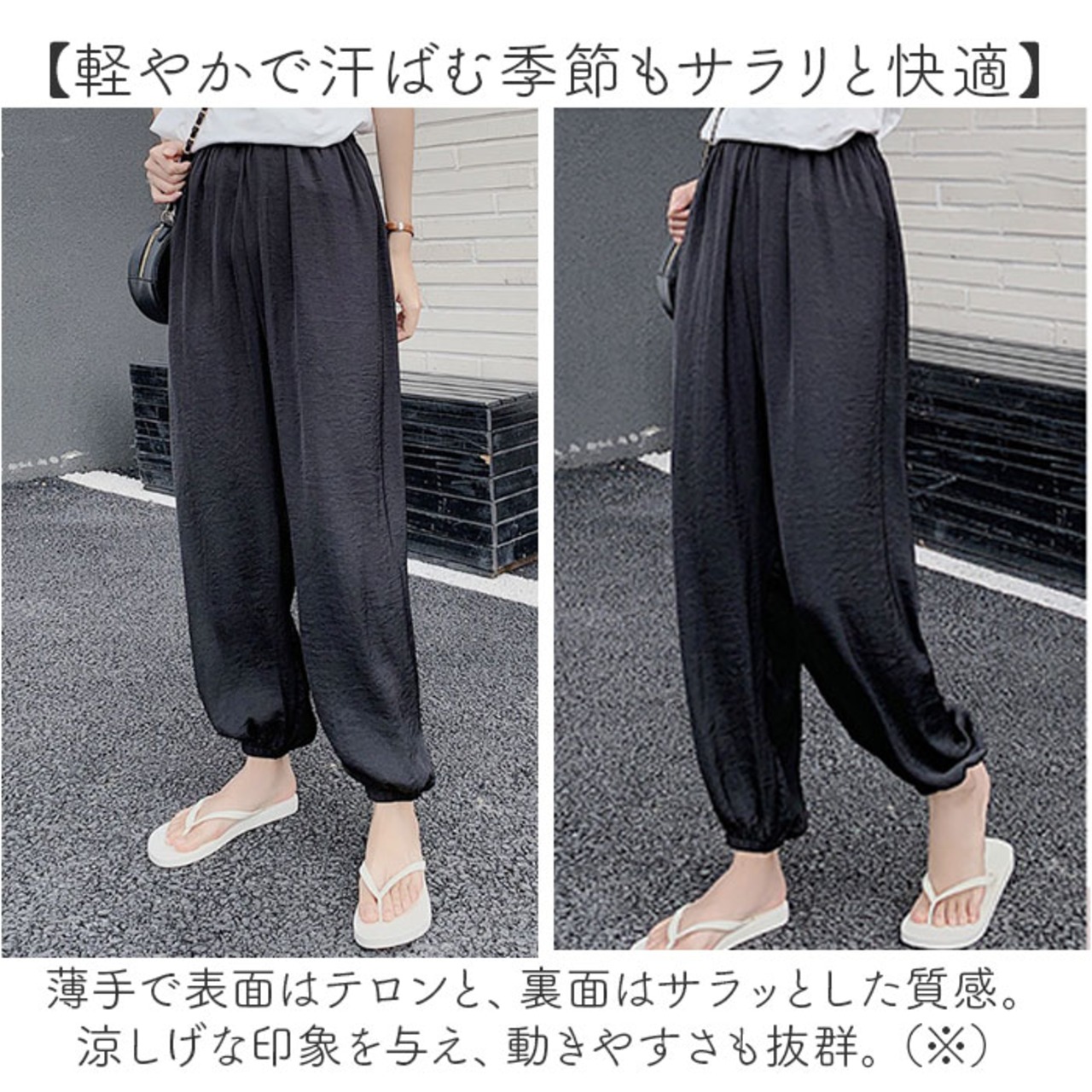 ・薄手で表面はテロンと、裏面はサラッとした質感。涼しげな印象を与え、動きやすさも抜群。