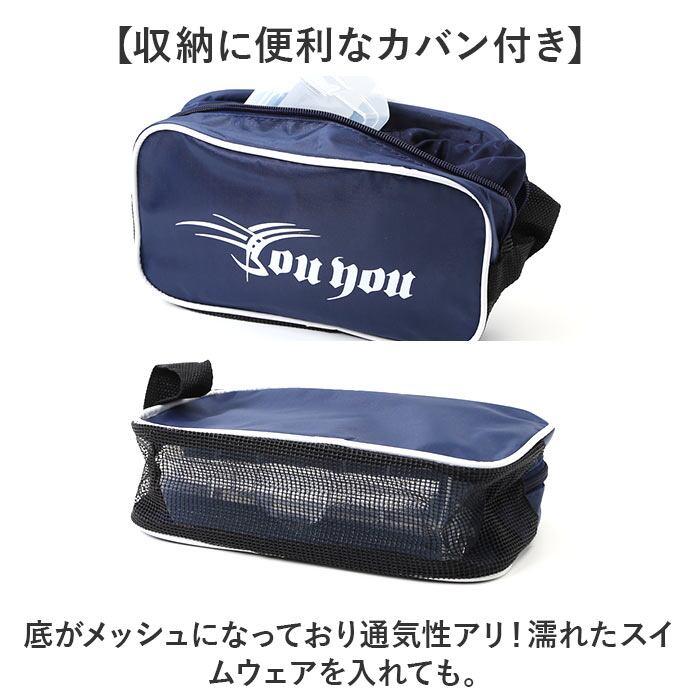 ・カバン・耳栓付きゴーグル・予備耳栓・鼻栓・パンツ・帽子のシンプルなスイムウェアセット。