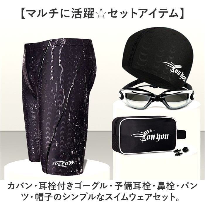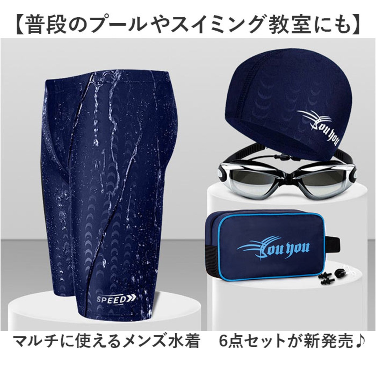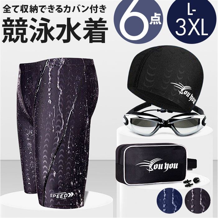 競泳水着 メンズ 水着 6点セット 通販 フィットネス水着 メンズ水着 メンズ競泳用水着 水泳パンツ スポーツ水着 スイムウェア スイムバック キャップ ゴーグル ミラーゴーグル 耳栓 鼻栓付 スイムキャップ バック トランクス型 トランクス 吸汗速乾 男性用