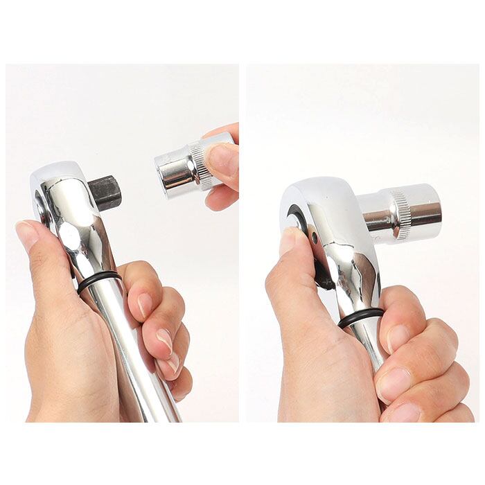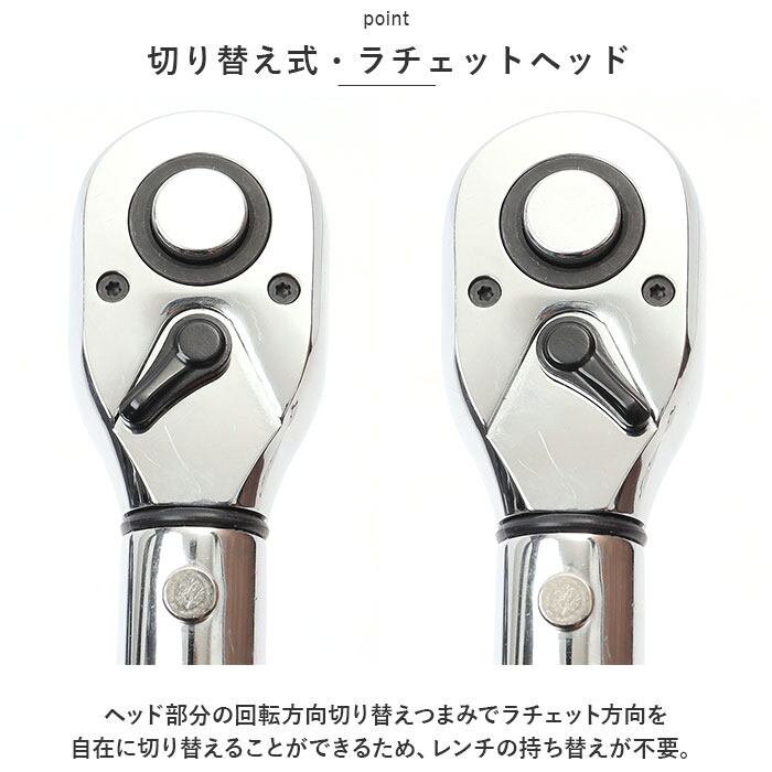 ・ヘッド部分の回転方向切り替えつまみでラチェット方向を自在に切り替えることができるため、レンチの持ち替えが不要。