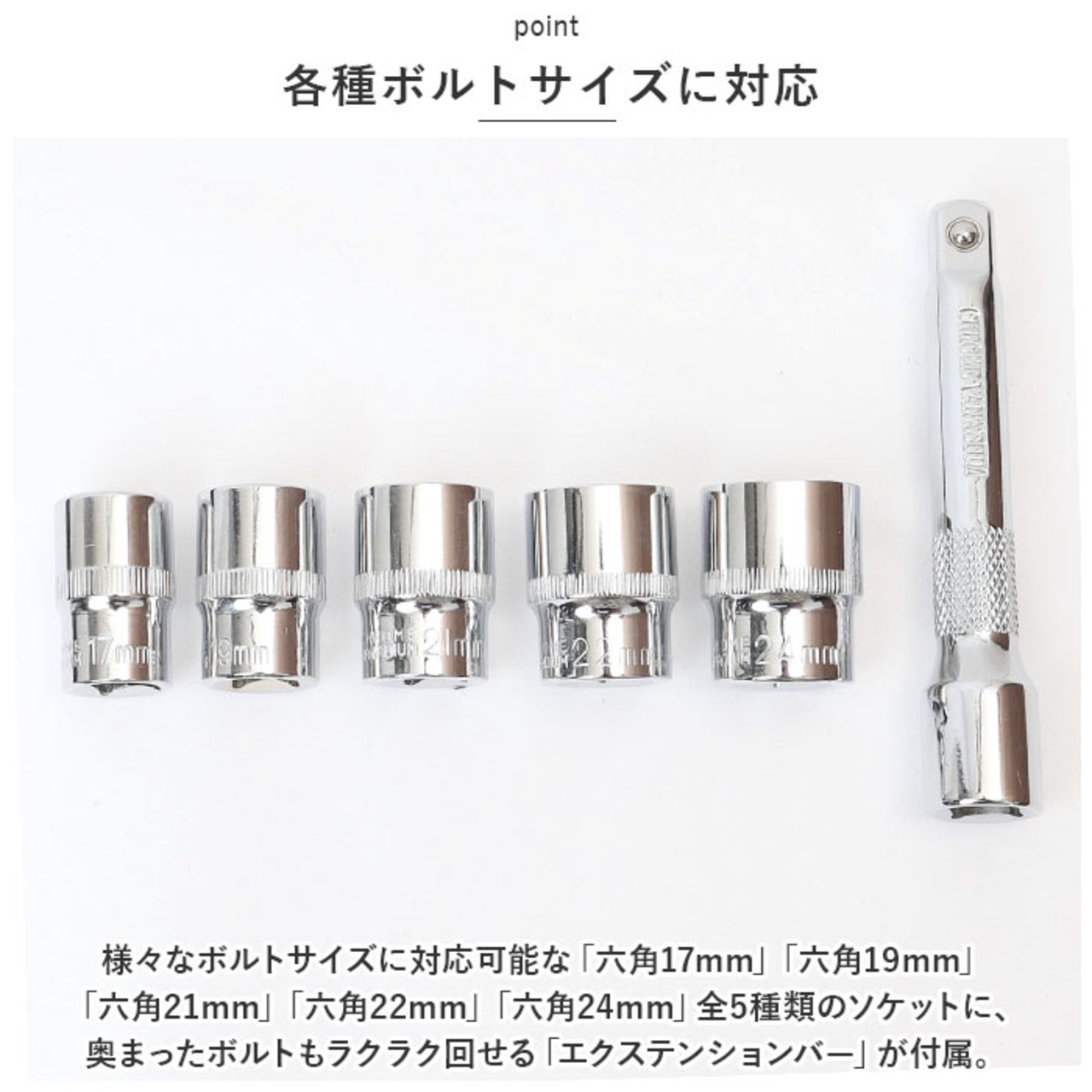 ・様々なボルトサイズに対応可能な「六角17mm」「六角19mm」「六角21mm」「六角22mm」「六角24mm」全5種類のソケットに、奥まったボルトもラクラク回せる「エクステンションバー」が付属。