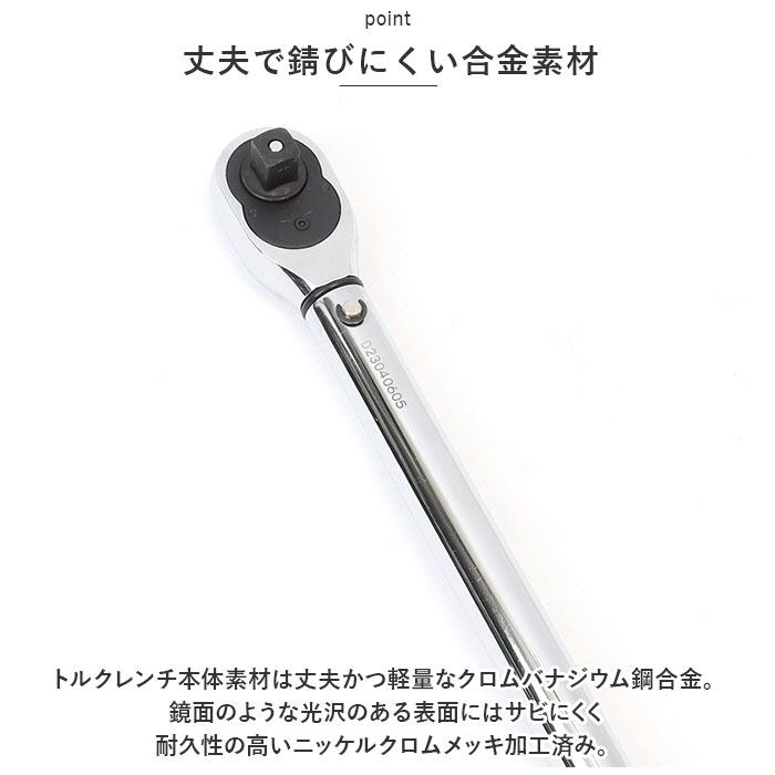 ・トルクレンチ本体素材は丈夫かつ軽量なクロムバナジウム鋼合金。鏡面のような光沢のある表面にはサビにくく耐久性の高いニッケルクロムメッキ加工済み。