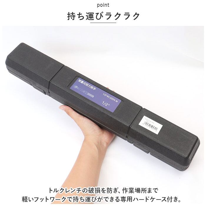 ・トルクレンチの破損を防ぎ、作業場所まで軽いフットワークで持ち運びができる専用ハードケース付き。