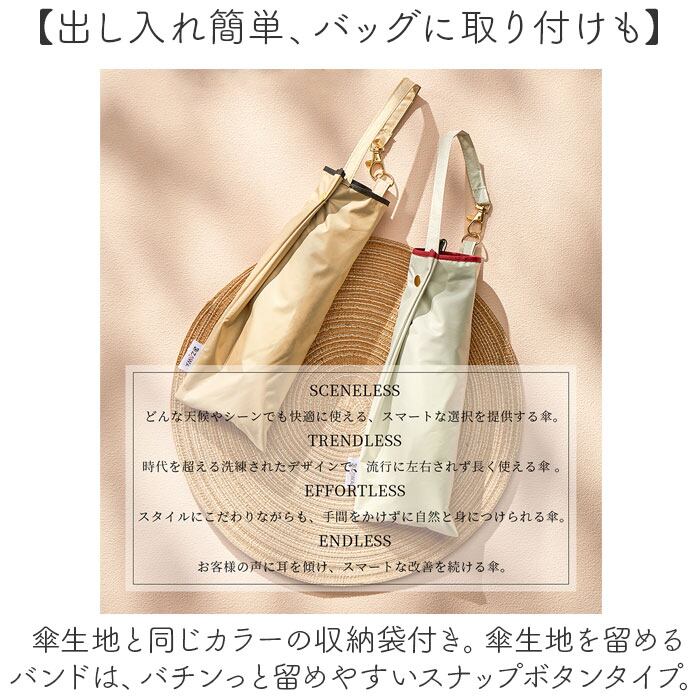 ※傘生地と同じカラーの収納袋付き。口が大きく開く&ナスカンでバッグに掛けて持ち歩き◎