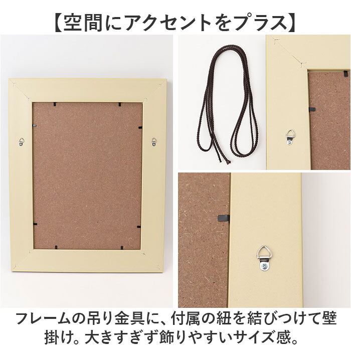 ・フレームの吊り金具に、付属の紐を結びつけて壁掛け。大きすぎず飾りやすいサイズ感。