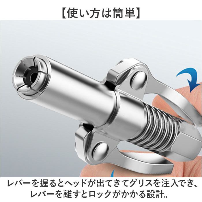 ・レバーを握るとヘッドが出てきてグリスを注入でき、レバーを離すとロックがかかる設計。