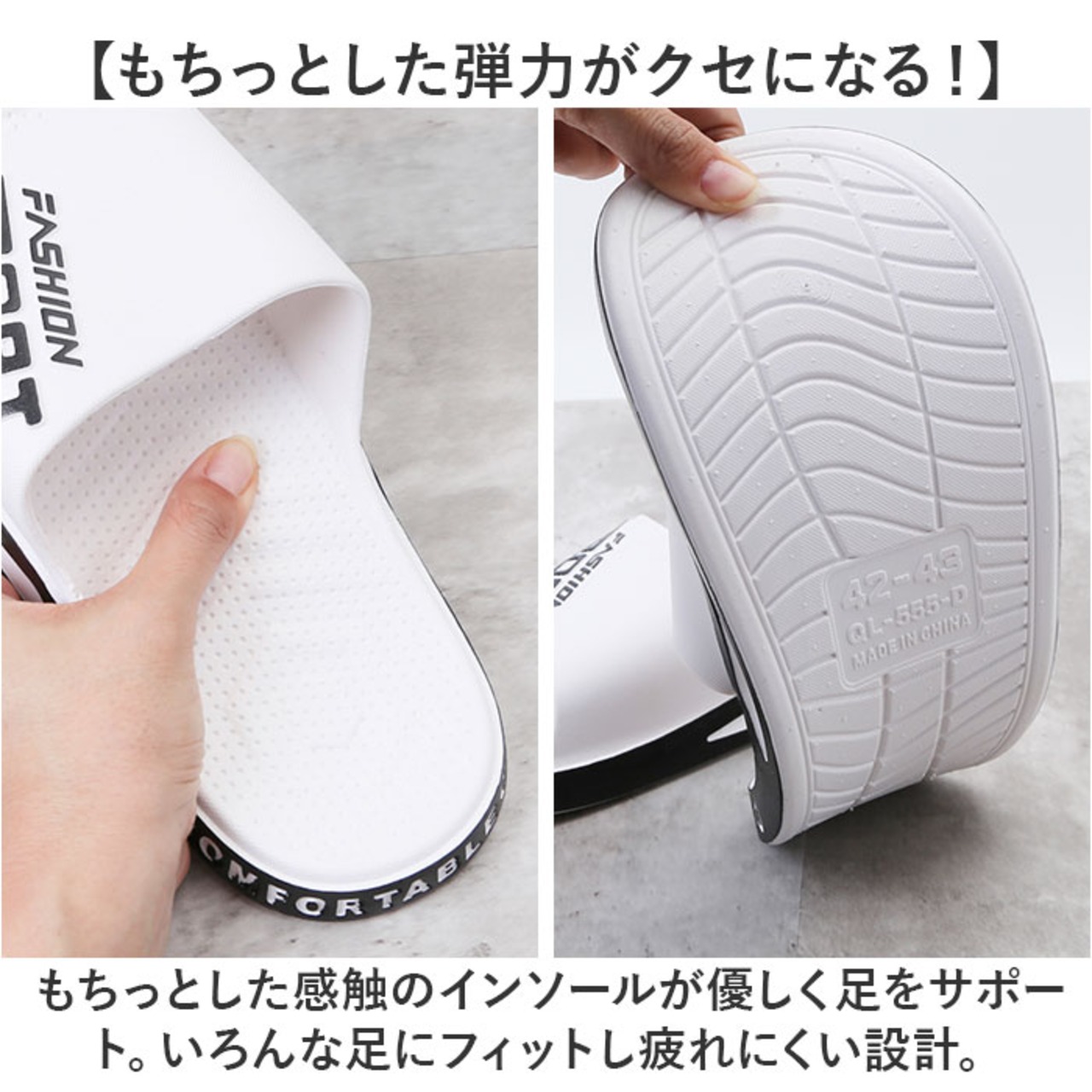 ・もちっとした感触のインソールが優しく足をサポート。いろんな足にフィットし疲れにくい設計。