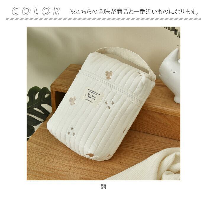 ・ふんわり軽いキルティング素材に、アニマルやフラワー等の可愛い刺繍がアクセントになったおむつバッグ。