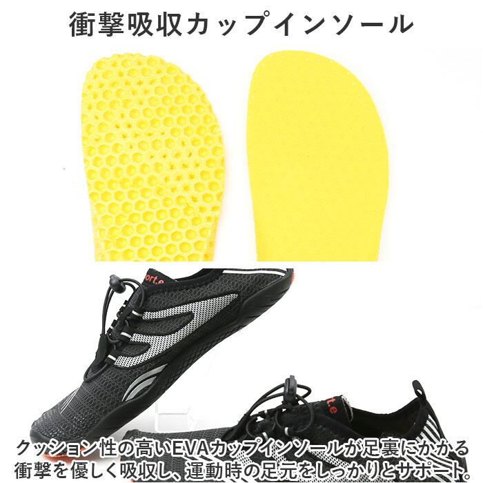 ・クッション性の高いEVAカップインソールが足裏にかかる衝撃を優しく吸収し、運動時の足元をしっかりとサポート。