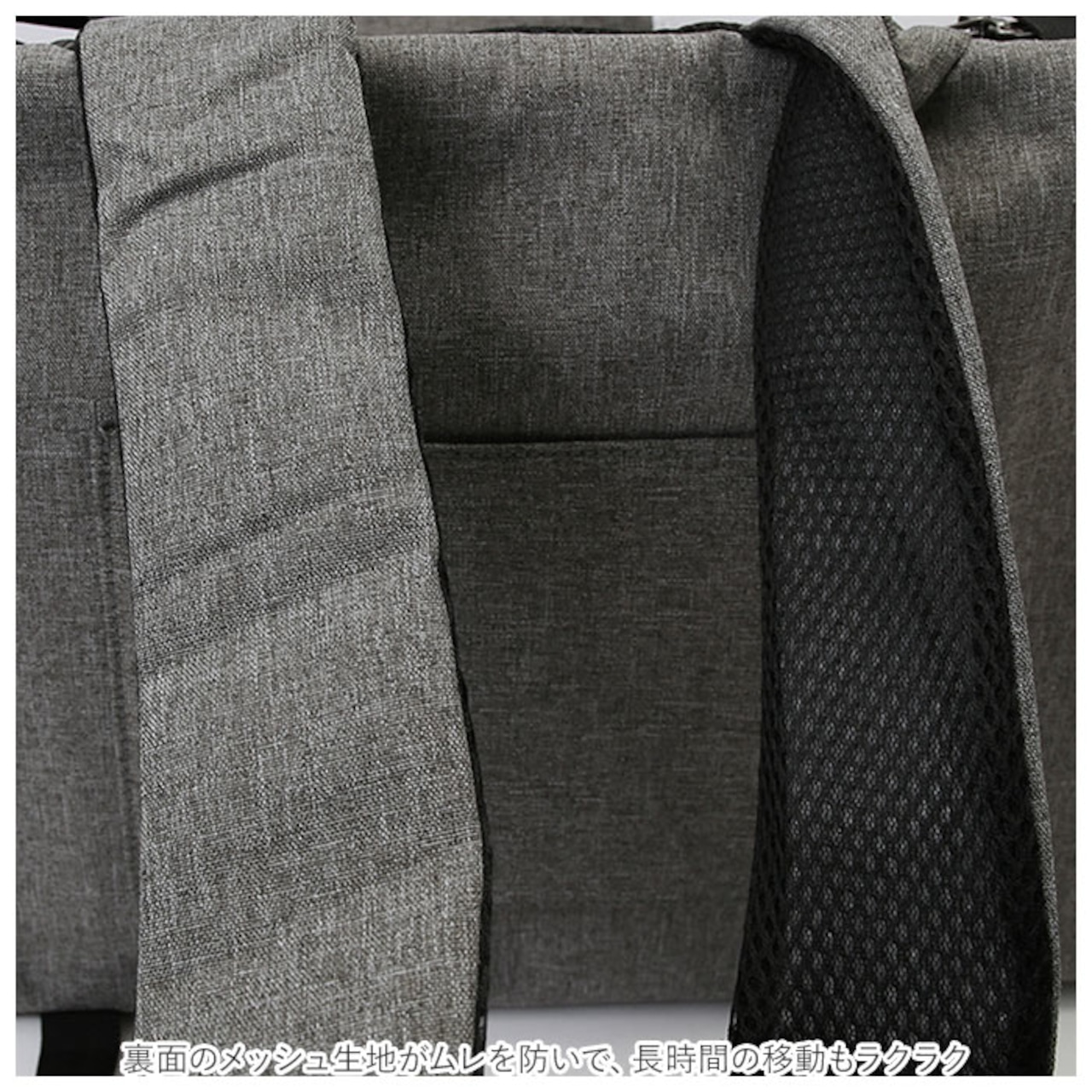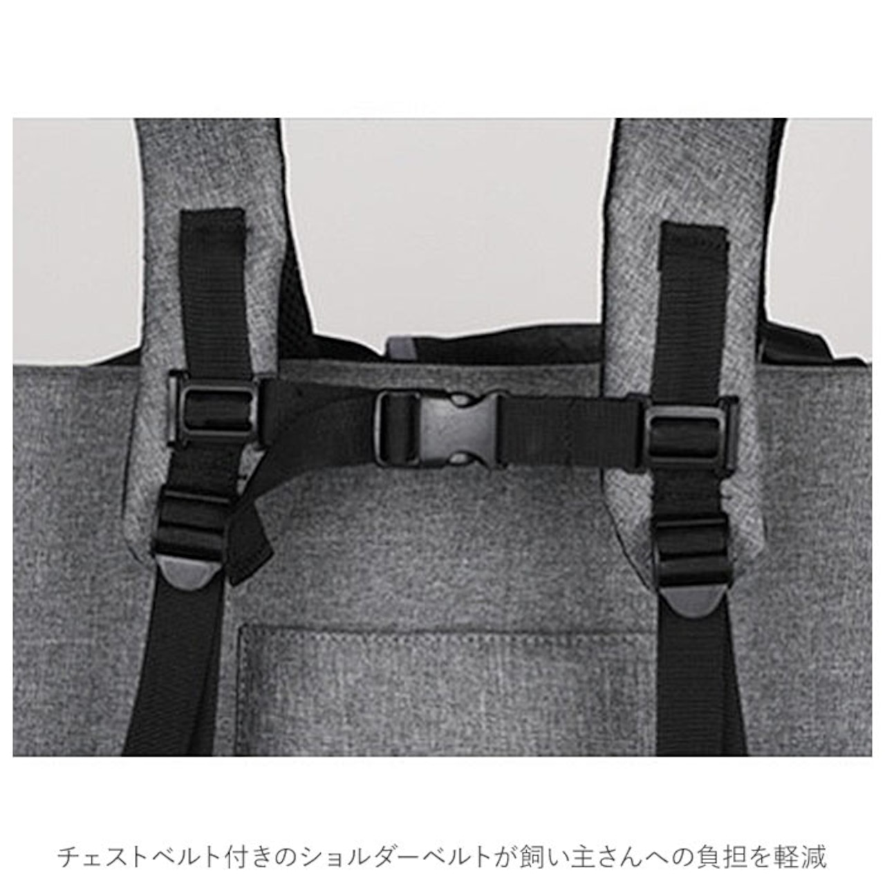 ・チェストベルト付きのショルダーベルトが飼い主さんへの負担を軽減。さらに、裏面のメッシュ生地がムレを防いで、長時間の移動もラクラク。