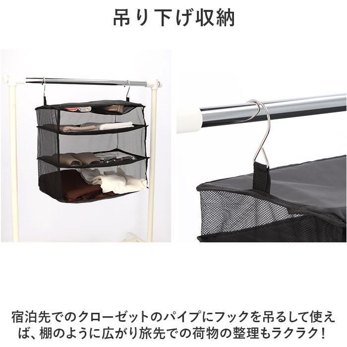 ・宿泊先でのクローゼットのパイプにフックを吊るして使えば、棚のように広がり旅先での荷物の整理もラクラク!