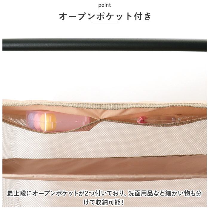 ・最上段にオープンポケットが2つ付いており、洗面用品など細かい物も分けて収納可能!