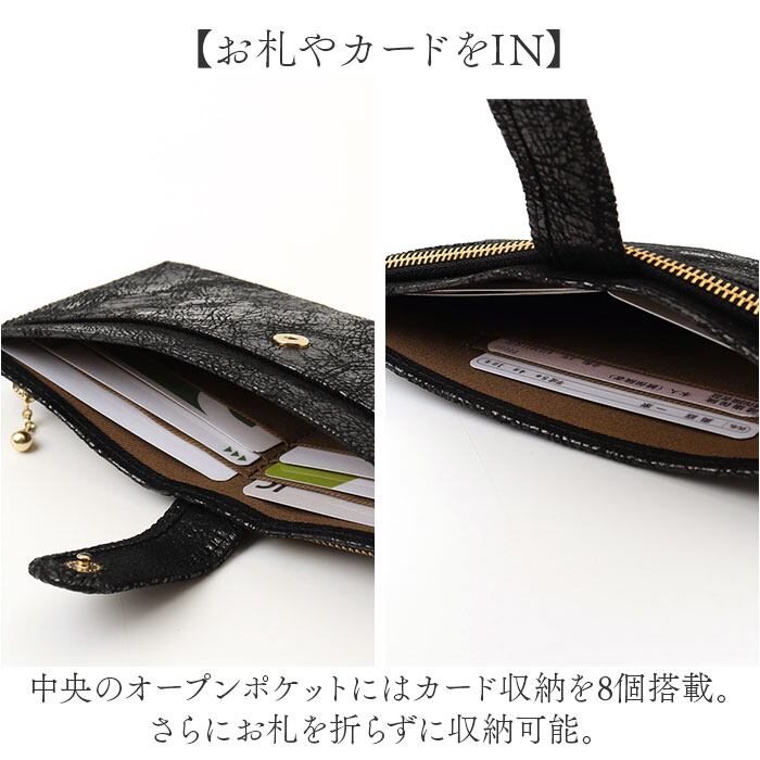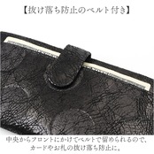 ・中央からフロントにかけてベルトで留められるので、カードやお札の抜け落ち防止に。