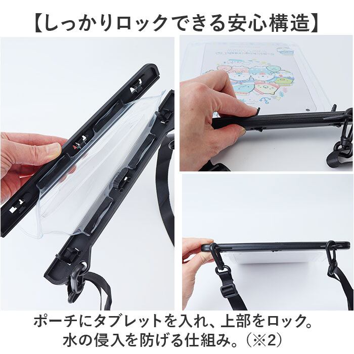 ・ポーチにタブレットを入れ、上部をロック。水の侵入を防げる仕組み。