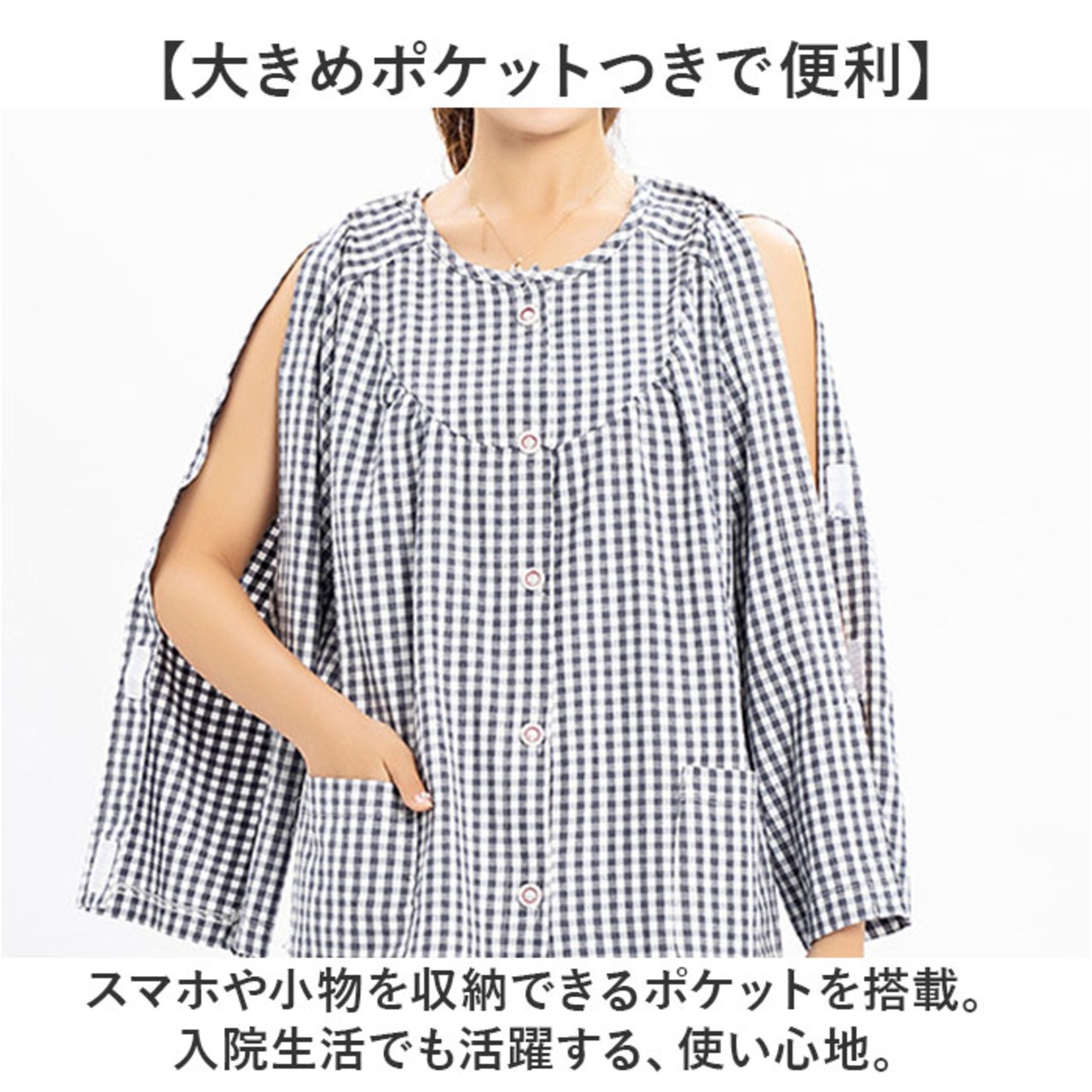 ・スマホや小物を収納できるポケットを搭載。入院生活でも活躍する、使い心地。