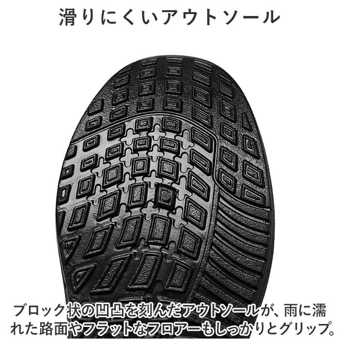 ・ブロック状の凹凸を刻んだアウトソールが、雨に濡れた路面やフラットなフロアーもしっかりとグリップ。