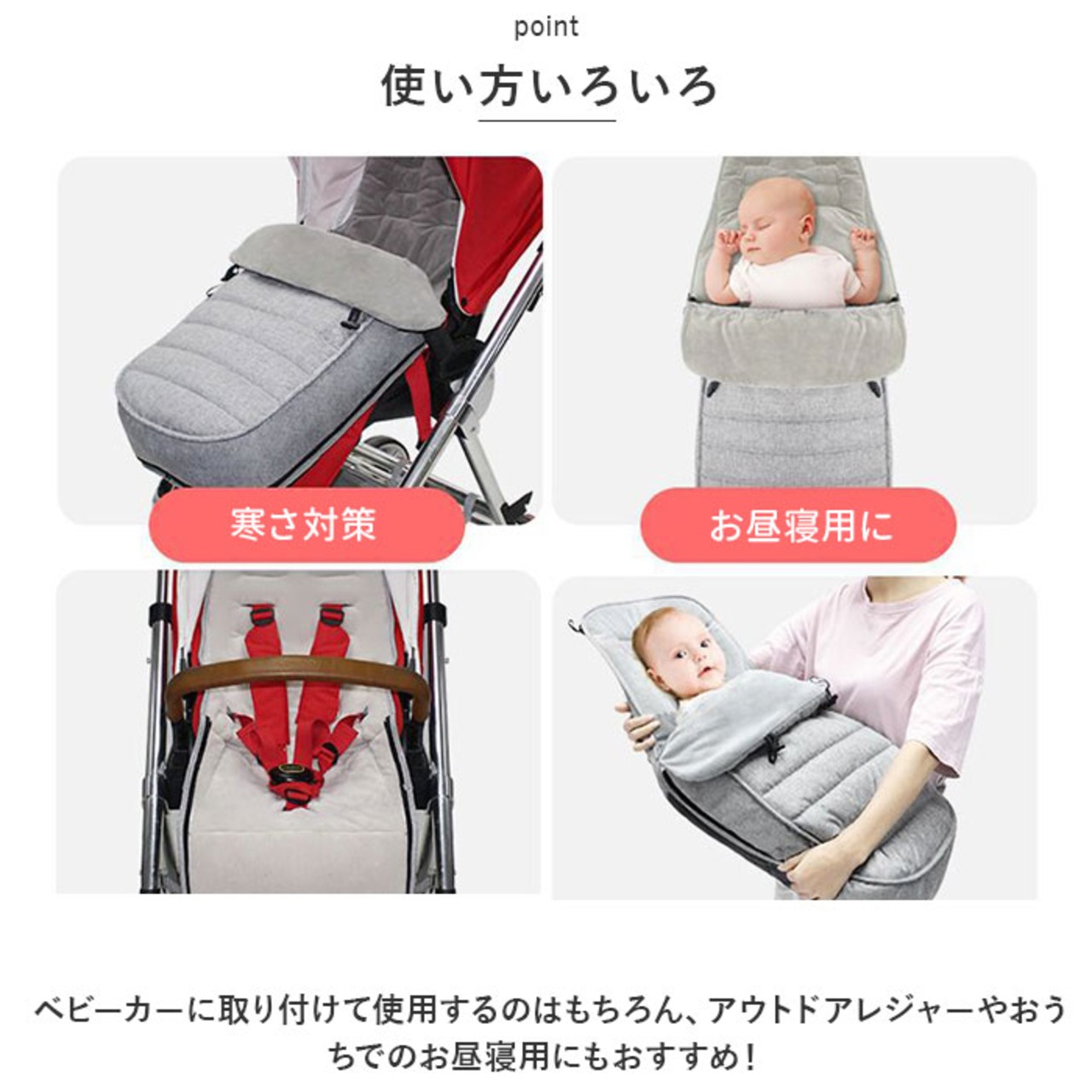 ・ベビーカーに取り付けて使用するのはもちろん、アウトドアレジャーやおうちでのお昼寝用にもおすすめ!