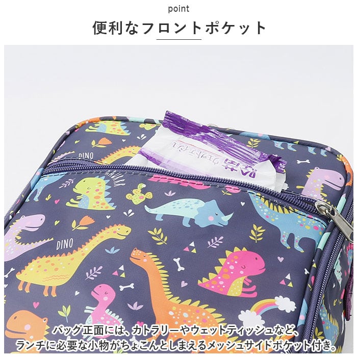 ・バッグ正面には、カトラリーやウェットティッシュなど、ランチに必要な小物がちょこんとしまえるメッシュサイドポケット付き。