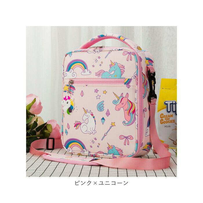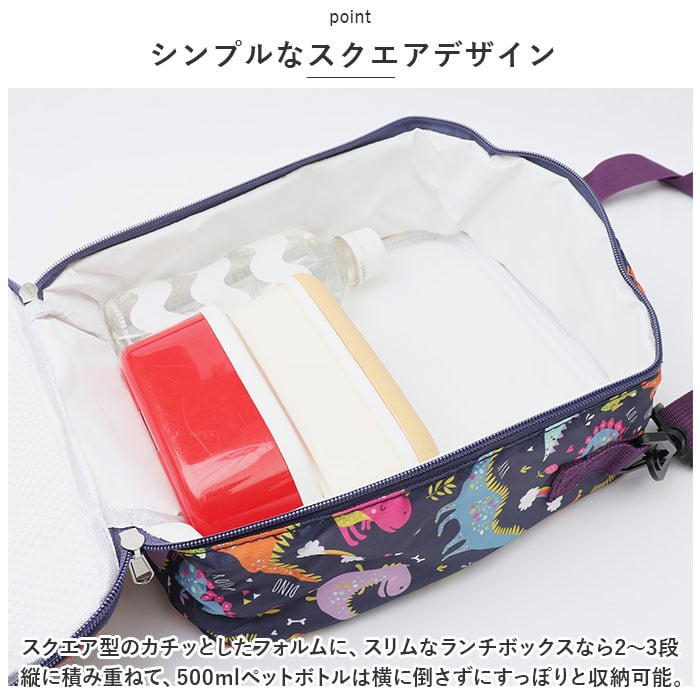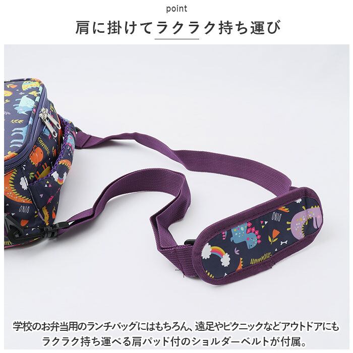 ・学校のお弁当用のランチバッグにはもちろん、遠足やピクニックなどアウトドアにもラクラク持ち運べる肩パッド付のショルダーベルトが付属。